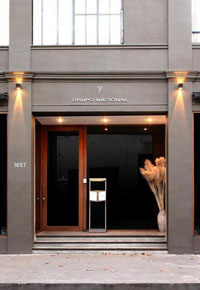 Fachada neta y minimalista, con amplia vereda y grandes ventanales del tipo vidriera