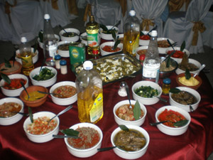 Mesa de ensaladas: variedad de verduras - escabeches - encurtidos - ensalada rusa - papas fritas.